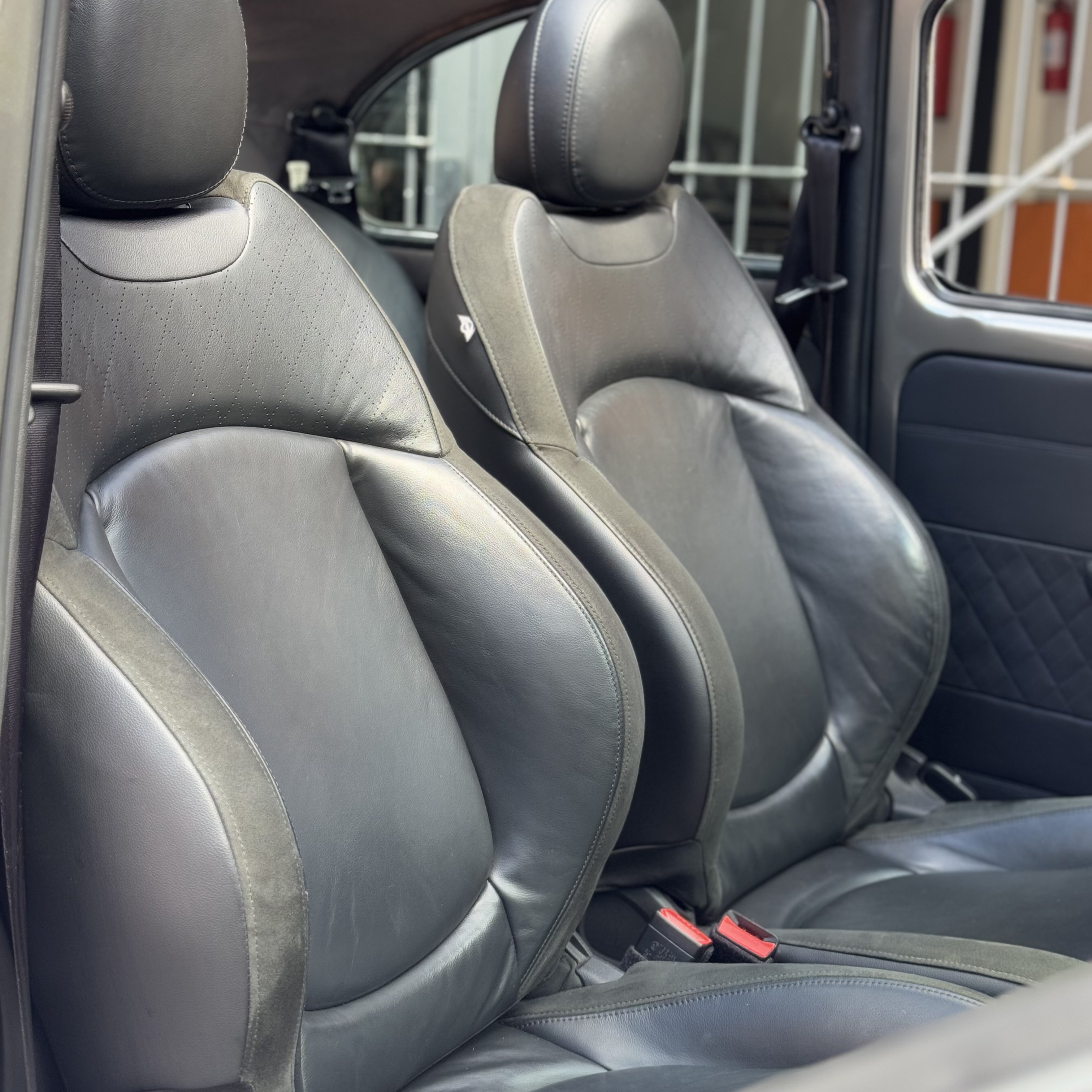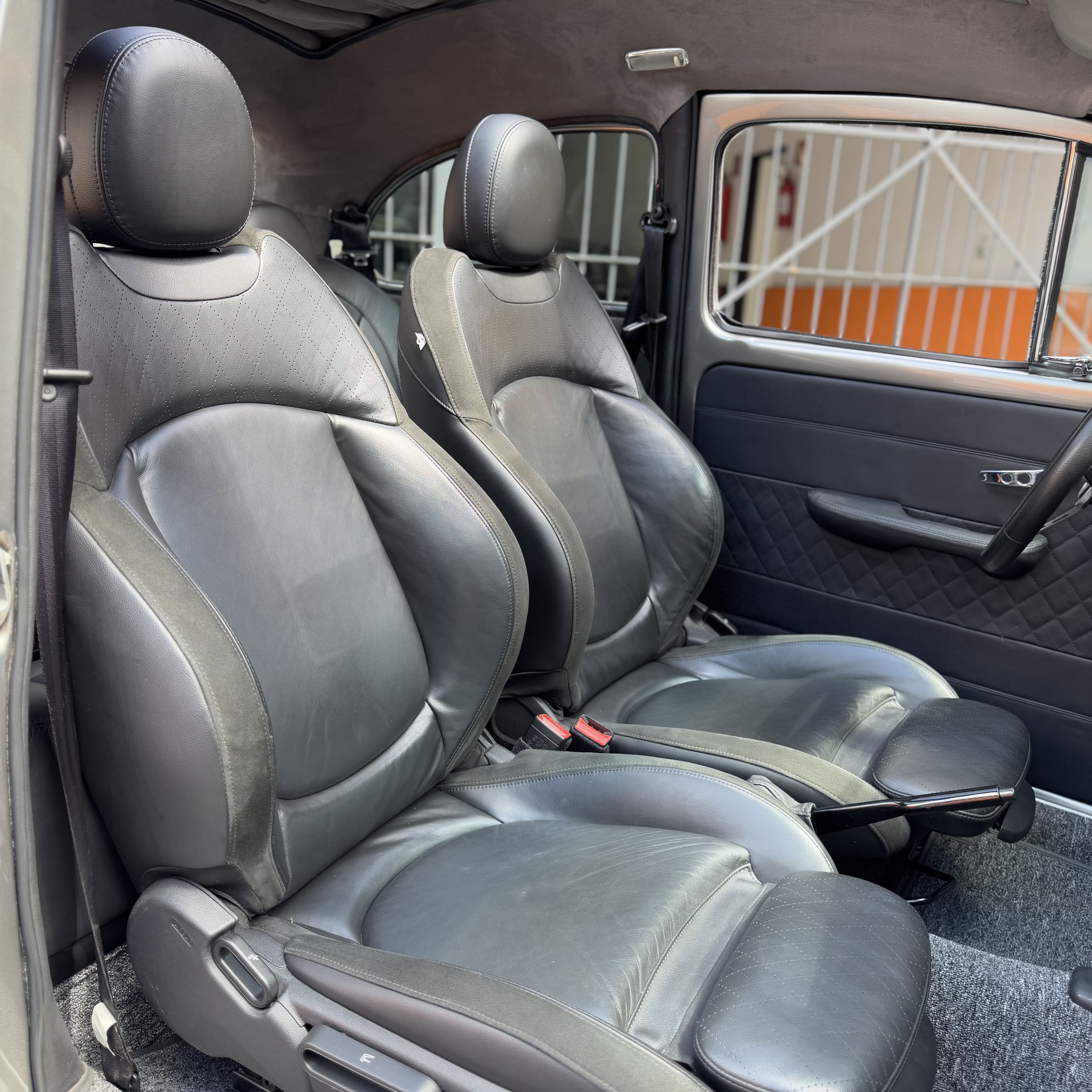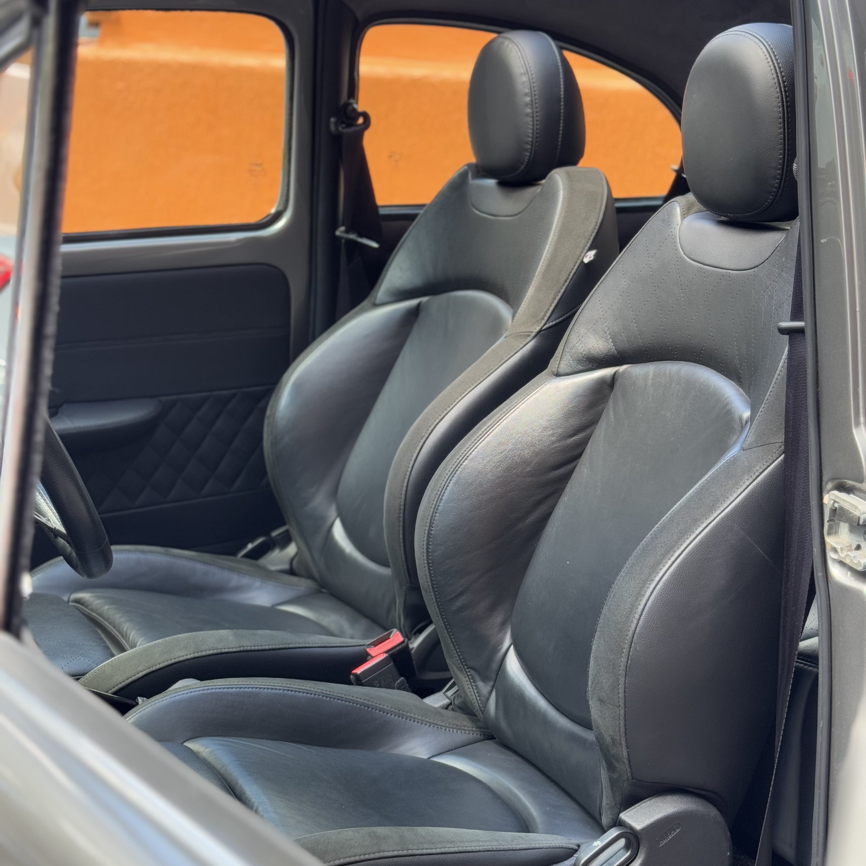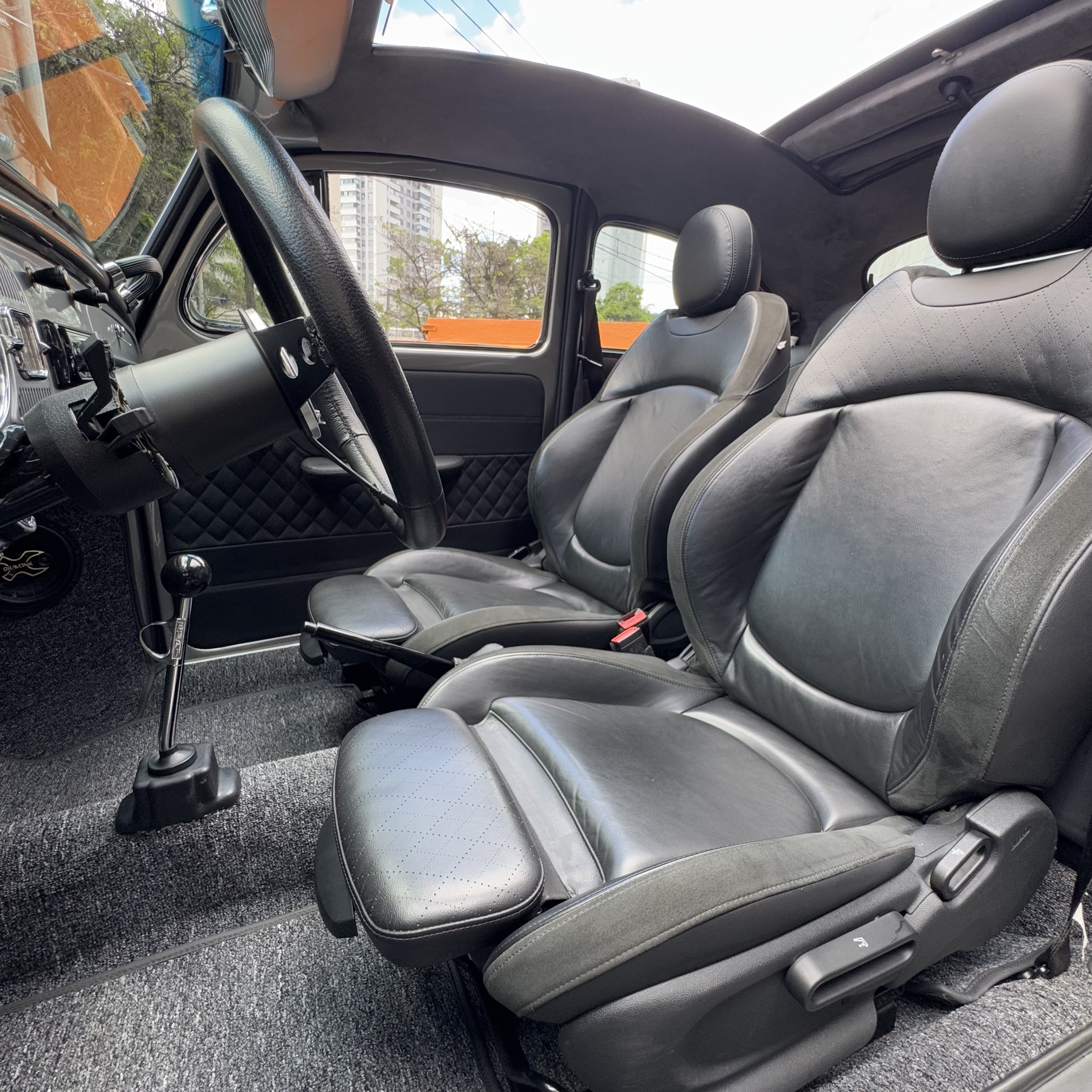 -Tapeçaria em couro, com bancos de Mini Cooper e teto em Alcântara.